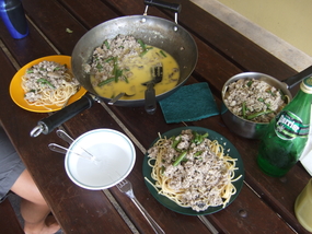 ホステルのキッチンに着いても、作る手順なんてお互い確認なんてせずにとにかく急いでそれぞれ作りはじめる。あまりないキッチンの調理器具や食器類も調達してスパゲッティの完成。